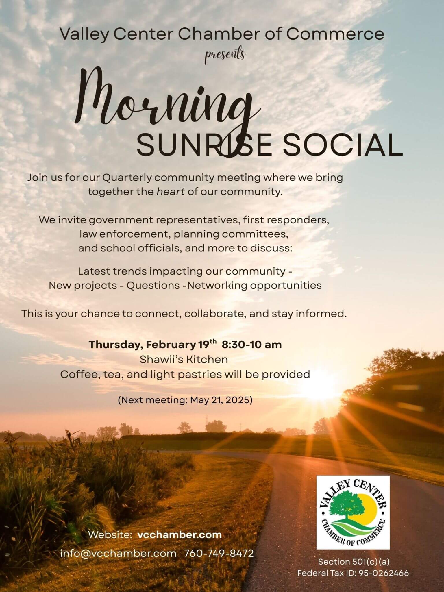 Valley Center Chamber of Commerce is a tax-exempt organization under Section 501(c)(a) of the Internal Revenue Code.